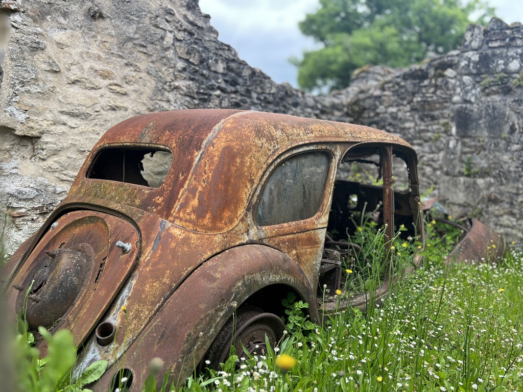 Oradour-sur-Glane: A ghost village, preserved in silence. In 1944, German SS troops massacred 643 inhabitants β mostly women and children β and left the ruins as they were. Visiting here is not like walking through history. It is walking through trauma. Burned prams. Rusting cars. Church walls blackened by fire and pitted with bullet holes where people prayed for sanctuary before the end. I left no book here β only silence and a promise to remember.
