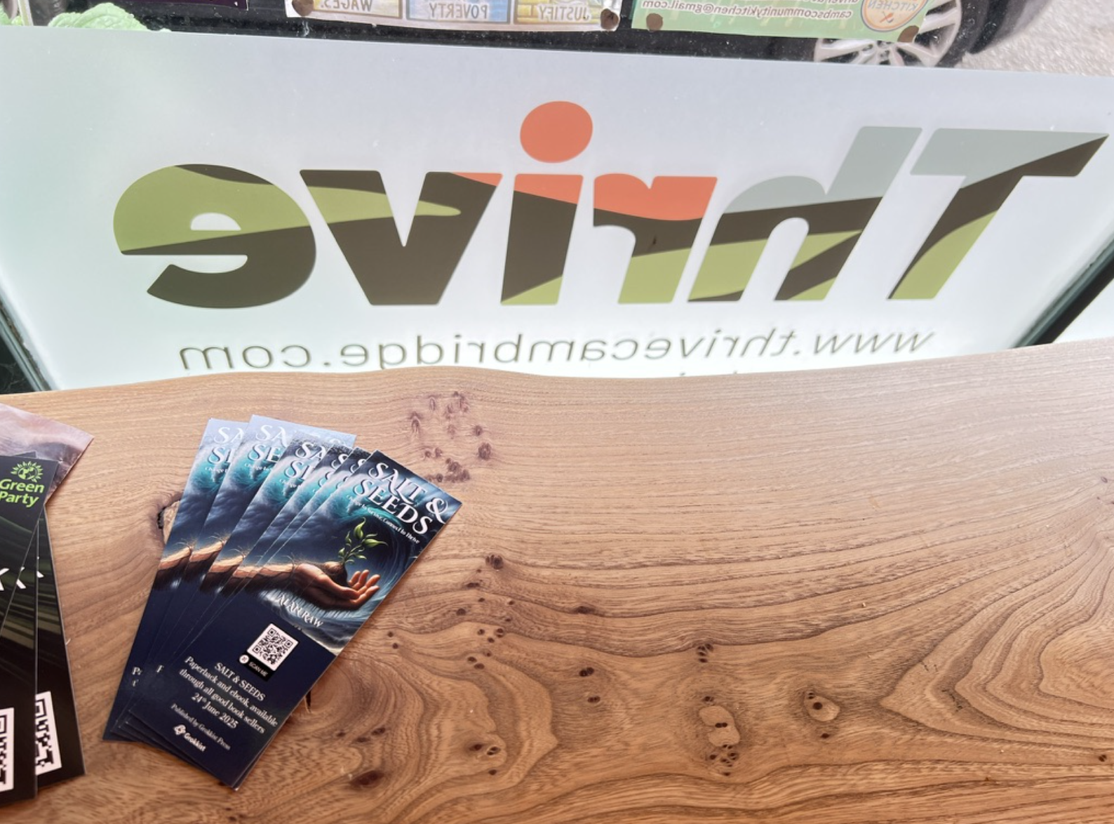 Thrive, Cambridge: A conscious, plant-powered book cafΓ© where solarpunk flyers sit next to flapjacks. I had a fabulous breakfast, leafed through a rich collection of books, and left bookmarks nestled throughout.