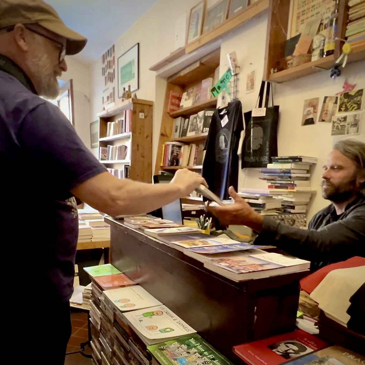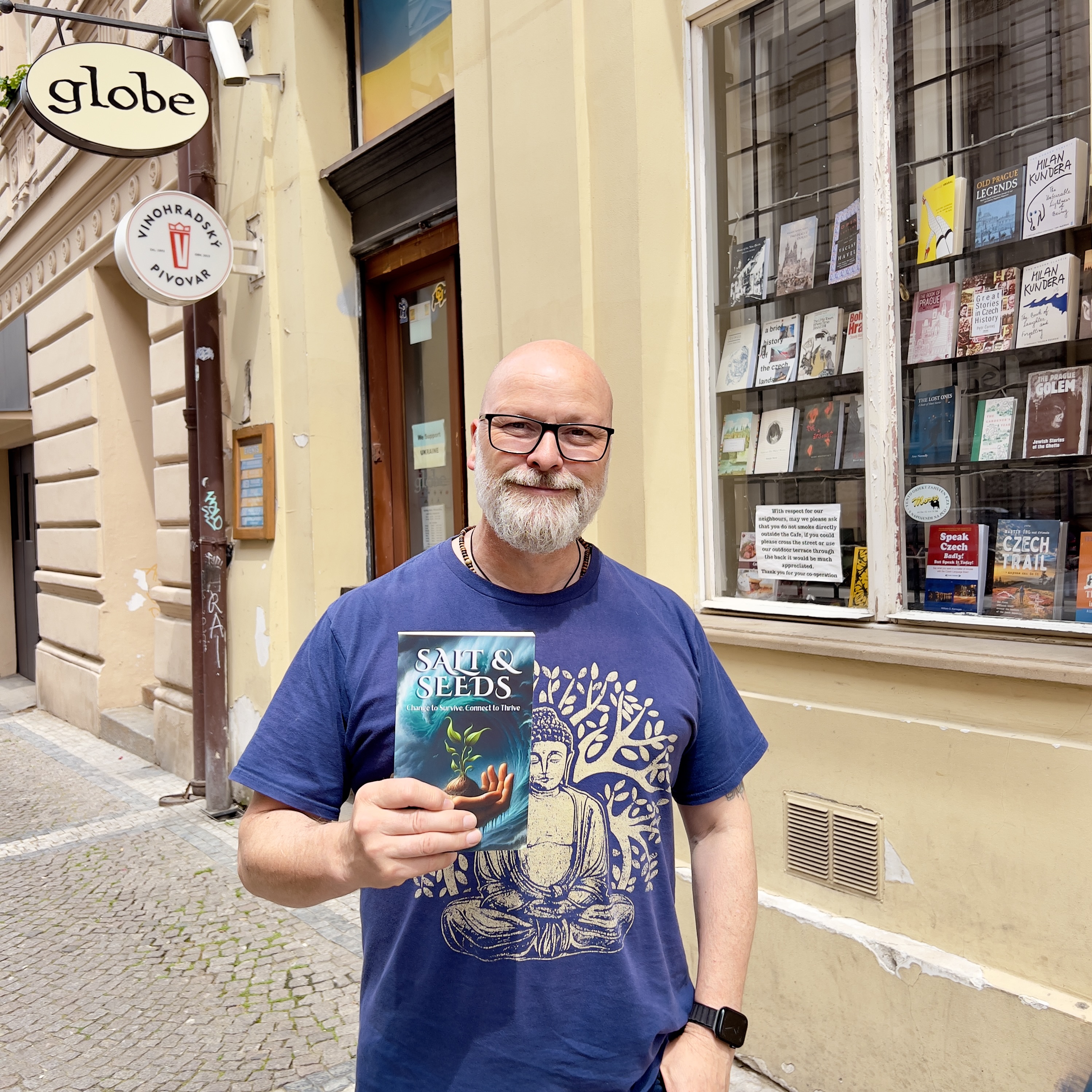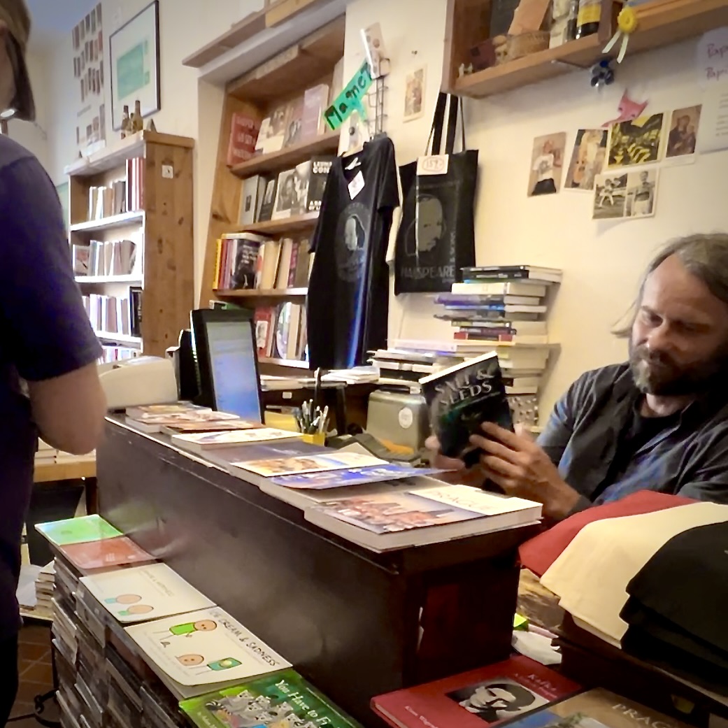 Czech Republic Prague – Globe Bookshop, with owner Michael. Globe now has 2 copies of Salt & Seeds